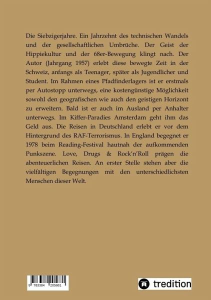 Die Siebzigerjahre. Ein Jahrzehnt des technischen Wandels und der gesellschaftlichen Umbrüche. Der Geist der Hippiekultur und der 68er-Bewegung klingt nach. Der Autor (Jahrgang 1957) erlebt diese bewegte Zeit in der Schweiz, anfangs als Teenager, später als Jugendlicher und Student. Im Rahmen eines Pfadfinderlagers ist er erstmals per Autostopp unterwegs, eine kostengünstige Möglichkeit sowohl den geografischen wie auch den geistigen Horizont zu erweitern. Bald ist er auch im Ausland per Anhalter unterwegs. Im Kiffer-Paradies Amsterdam geht ihm das Geld aus. Die Reisen in Deutschland erlebt er vor dem Hintergrund des RAF-Terrorismus. In England begegnet er 1978 beim Reading-Festival hautnah der aufkommenden Punkszene. Love, Drugs & Rock'n'Roll prägen die abenteuerlichen Reisen, vor allem aber die vielfältigen Begegnungen mit den unterschiedlichsten Menschen dieser Welt. Als Ich-Erzähler beschreibt der Autor seine Erlebnisse aus seiner damaligen Sicht, meist ohne zu werten. Allgemein gültige Normen und Moralvorstellungen haben sich seither gewandelt. Als Leserin oder Leser wird man unvermittelt mit dem Wandel der gesellschaftlichen Wertvorstellungen konfrontiert.