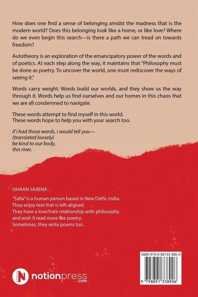 How does one find a sense of belonging amidst the madness that is the modern world? Does this belonging look like a home, or like love? Where do we even begin this search-is there a path we can tread on towards freedom? Autotheory is an exploration of the emancipatory power of the words and of poetics. At each step along the way, it maintains that "Philosophy must be done as poetry. To uncover the world, one must rediscover the ways of seeing it." Words carry weight. Words build our worlds, and they show us the way through it. Words help us find ourselves and our homes in this chaos that we are all condemned to navigate. These words attempt to find my self in this world. These words hope to help you with your search too. if i had those words, i would tell you- (translated loosely) be kind to our body, this river.