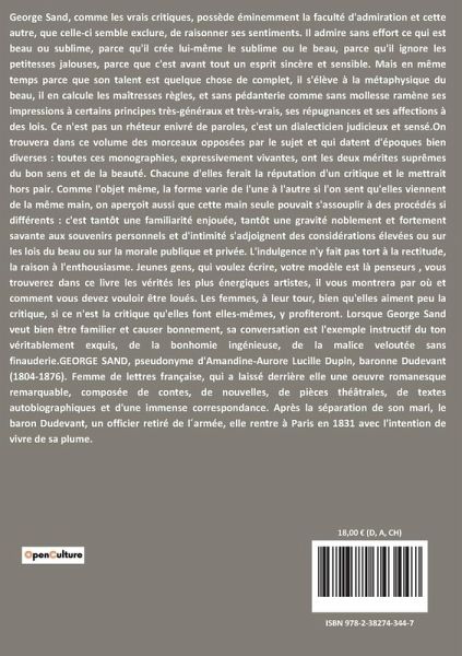 George Sand, comme les vrais critiques, possède éminemment la faculté d'admiration et cette autre, que celle-ci semble exclure, de raisonner ses sentiments. Il admire sans effort ce qui est beau ou sublime, parce qu'il crée lui-même le sublime ou le beau, parce qu'il ignore les petitesses jalouses, parce que c'est avant tout un esprit sincère et sensible. Mais en même temps parce que son talent est quelque chose de complet, il s'élève à la métaphysique du beau, il en calcule les maîtresses règles, et sans pédanterie comme sans mollesse ramène ses impressions à certains principes très-généraux et très-vrais, ses répugnances et ses affections à des lois. Ce n'est pas un rhéteur enivré de paroles, c'est un dialecticien judicieux et sensé.On trouvera dans ce volume des morceaux opposées par le sujet et qui datent d'époques bien diverses : toutes ces monographies, expressivement vivantes, ont les deux mérites suprêmes du bon sens et de la beauté. Chacune d'elles ferait la réputation d'un critique et le mettrait hors pair. Comme l'objet même, la forme varie de l'une à l'autre si l'on sent qu'elles viennent de la même main, on aperçoit aussi que cette main seule pouvait s'assouplir à des procédés si différents : c'est tantôt une familiarité enjouée, tantôt une gravité noblement et fortement savante aux souvenirs personnels et d'intimité s'adjoignent des considérations élevées ou sur les lois du beau ou sur la morale publique et privée. L'indulgence n'y fait pas tort à la rectitude, la raison à l'enthousiasme. Jeunes gens, qui voulez écrire, votre modèle est là penseurs , vous trouverez dans ce livre les vérités les plus énergiques artistes, il vous montrera par où et comment vous devez vouloir être loués. Les femmes, à leur tour, bien qu'elles aiment peu la critique, si ce n'est la critique qu'elles font elles-mêmes, y profiteront. Lorsque George Sand veut bien être familier et causer bonnement, sa conversation est l'exemple instructif du ton véritablement exquis, de la bonhomie ingénieuse, de la malice veloutée sans finauderie.GEORGE SAND, pseudonyme d'Amandine-Aurore Lucille Dupin, baronne Dudevant (1804-1876). Femme de lettres française, qui a laissé derrière elle une oeuvre romanesque remarquable, composée de contes, de nouvelles, de pièces théâtrales, de textes autobiographiques et d'une immense correspondance. Après la séparation de son mari, le baron Dudevant, un officier retiré de l¿armée, elle rentre à Paris en 1831 avec l'intention de vivre de sa plume.