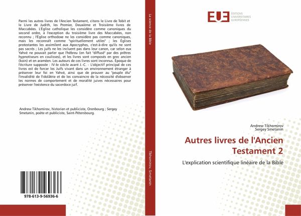 Parmi les autres livres de l'Ancien Testament, citons le Livre de Tobit et le Livre de Judith, les Premier, Deuxième et Troisième livres de Maccabées. L'Église catholique les considère comme canoniques du second ordre, à l'exception du troisième livre des Maccabées, non reconnu ; l'Église orthodoxe ne les considère pas comme canoniques, mais les reconnaît comme "spirituellement utiles" ; les Églises protestantes les assimilent aux Apocryphes, c'est-à-dire qu'ils ne sont pas sacrés ; Les juifs ne les incluent pas dans leur canon, car selon eux Yahvé ne pouvait parler que l'hébreu (en fait "diffusé" par des prêtres hypnotiseurs en coulisses), et les livres sont composés en grec ancien (koin) et en araméen. Les auteurs de ces livres sont inconnus. Époque de l'écriture supposée : IV-Ie siècle avant J.-C. - L'objectif principal de ces livres est de forcer les Juifs vivant dans un environnement étranger à préserver leur foi en Yahvé, ainsi que de prouver au "peuple élu" l'invalidité del'idolâtrie et de les convaincre de la nécessité d'observer les normes de comportement et de moralité juives nécessaires pour préserver l'existence du sacerdoce juif.