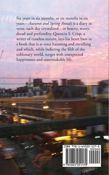 Six years in six months, or six months in six years-Autumn and Spring Annals is a diary in verse, each day crystalized-in beauty, worry, dread and profundity. Quentin S. Crisp, a writer of timeless stature, lays his heart bare in a book that is at once haunting and enriching and which, while indicting the filth of the sublunary world, surges with unexpected happinesses and unmistakable life.
