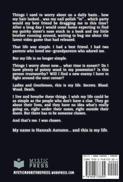 "Things I used to worry about on a daily basis... how my hair looked... was my nail polish "in"... which party would my best friend be dragging me to this time? After a long day I would come home expecting to find my quirky sister's nose stuck in a book and my little brother running around, waiting to bug me about the latest video game that had released. That life was simple. I had a best friend. I had two parents who loved me--grandparents who adored me. But my life is no longer simple. Things I worry about now... what time is sunset? Do I have plenty of pointy wood in my possession? Is this person trustworthy? Will I find a new enemy I have to fight around the next corner? Ladies and Gentlemen, this is my life. Secrets. Blood. Wood. Death. I live and breathe these things. I wish my life could be as simple as the people who don't have a clue. They go about their lives, and they have no idea what's really going on, right under their noses, right outside their doors ere has to be someone chosen. And that's me. I was chosen. My name is Hannah Autumn... and this is my life."--