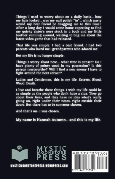 Things I used to worry about on a daily basis... how my hair looked... was my nail polish "in"... which party would my best friend be dragging me to this time? After a long day I would come home expecting to find my quirky sister's nose stuck in a book and my little brother running around, waiting to bug me about the latest video game that had released. That life was simple. I had a best friend. I had two parents who loved me--grandparents who adored me. But my life is no longer simple. Things I worry about now... what time is sunset? Do I have plenty of pointy wood in my possession? Is this person trustworthy? Will I find a new enemy I have to fight around the next corner? Ladies and Gentlemen, this is my life. Secrets. Blood. Wood. Death. I live and breathe these things. I wish my life could be as simple as the people who don't have a clue. They go about their lives, and they have no idea what's really going on, right under their noses, right outside their doors. But there has to be someone chosen. And that's me. I was chosen. My name is Hannah Autumn... and this is my life.