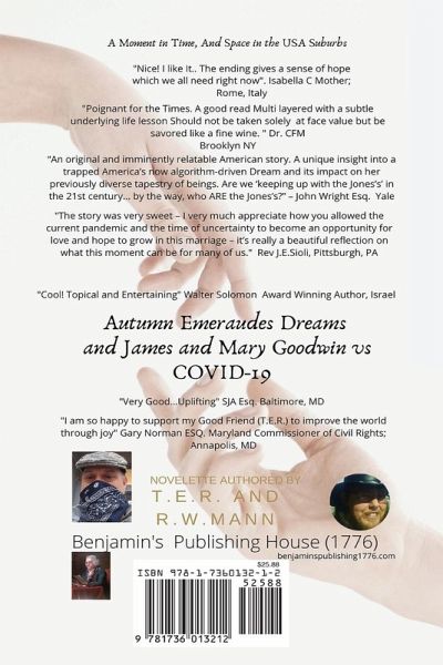 Autumn Emeruades Dream 2nd part of A Moment in Time, Space, and the USA Suburban Home book series. The worthy read is an original and imminently relatable uplifting American story. A unique insight into a trapped America's now algorithm-driven Dream and its impact on her previously diverse tapestry of beings. Are we 'keeping up with the Jones's' in the 21st century... by the way, who ARE the Jones's? A good read Multi layered with a subtle underlying life lesson that should not be taken solely at face value but be savored like a fine wine. James and Mary Goodwin VS COVID-19 is part 1 of the same series. Will Mary Goodwin throw James Goodwin out of the their St. Louis home in the middle of Covid-19 pandemic? Can James get over his fears and be the husband and father which Mary Goodwin needs? Can Mary Breakthrough to James? Will their 2 children need online therapy from too much gaming and makeup? What about their dogs? Can this family survive another night with each other and the Corona-virus in either the wind or air? It is a fictional cool and entertaining worth read about love and hope for a family during the 2020 global pandemic. These distinguish and brilliant authors bring forth the first and a worthy romantic comedy of 2020 about the time that we all live in and through during 2020 virus pandemic. The worthy uplifting read is embraced by readers and critics all over the word has read. They have call it very good, poignant of the times, an original and imminently relatable uplifting and very sweet stories allowing the current pandemic and the time of uncertainty to become an opportunity for love and hope to grow in this marriage - it's really a beautiful reflection on what this moment can be for many of us..
