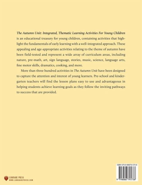 The Autumn Unit: Integrated, Thematic Learning Activities For Young Children is an educational treasury for young children, containing activities that highlight the fundamentals of early learning with a well-integrated approach. These appealing and age-appropriate activities relating to the theme of autumn have been field-tested and represent a wide array of curriculum areas, including nature, pre-math, art, sign language, stories, music, science, language arts, fine motor skills, dramatics, cooking, and more. More than three hundred activities in The Autumn Unit have been designed to capture the attention and interest of young learners. Pre-school and kindergarten teachers will find the lesson plans easy to use and advantageous in helping students achieve learning goals as they follow the inviting pathways to success that are provided.