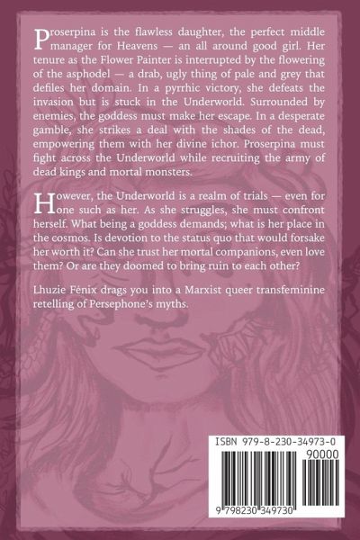 Lhuzie Fénix drags you into a Marxist queer transfeminine retelling of Persephone's myths. Proserpina is the flawless daughter, the perfect middle manager for Heavens - an all around good girl. Her tenure as the Flower Painter is interrupted by the flowering of the asphodel - a drab, ugly thing of pale and grey that defiles her domain. In a pyrrhic victory, she defeats the invasion but is stuck in the Underworld. Surrounded by enemies, the goddess must make her escape. In a desperate gamble, she strikes a deal with the shades of the dead, empowering them with her divine ichor. Proserpina must fight across the Underworld while recruiting the army of dead kings and mortal monsters. However, the Underworld is a realm of trials - even for one such as her. As she struggles, she must confront herself. What being a goddess demands; what is her place in the cosmos. Is devotion to the status quo that would forsake her worth it? Can she trust her mortal companions, even love them? Or are they doomed to bring ruin to each other?
