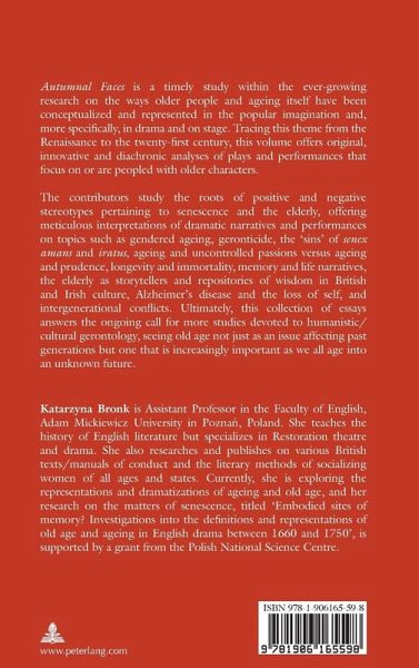 Autumnal Faces is a timely study within the ever-growing research on the ways older people and ageing itself have been conceptualized and represented in the popular imagination and, more specifically, in drama and on stage. Tracing this theme from the Renaissance to the twenty-first century, this volume offers original, innovative and diachronic analyses of plays and performances that focus on or are peopled with older characters. The contributors study the roots of positive and negative stereotypes pertaining to senescence and the elderly, offering meticulous interpretations of dramatic narratives and performances on topics such as gendered ageing, geronticide, the «sins» of senex amans and iratus, ageing and uncontrolled passions versus ageing and prudence, longevity and immortality, memory and life narratives, the elderly as storytellers and repositories of wisdom in British and Irish culture, Alzheimer's disease and the loss of self, and intergenerational conflicts. Ultimately, this collection of essays answers the ongoing call for more studies devoted to humanistic/cultural gerontology, seeing old age not just as an issue affecting past generations but one that is increasingly important as we all age into an unknown future.