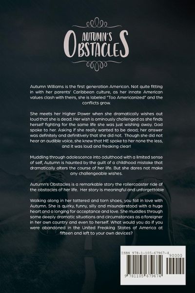 "Autumn's Obstacles" is an inspiring story of divine guidance. The reader will laugh and cry while compelled to route for Autumn as she navigates the roller coaster ride of her challenging life. Making a wish that is divinely challenged, Autumn's dramatic wish and near death experience introduces her to God. She develops a relationship with her heavenly father who ominously directs her through survival and triumph over the obstacles of her life.