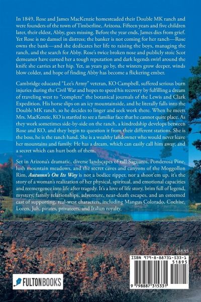 In 1849, Rose and James MacKenzie homesteaded their Double MK ranch and were founders of the town of Timberline, Arizona. Fifteen years and five children later, their eldest, Abby, goes missing. Before the year ends, James dies from grief. Yet Rose is no damsel in distress; the banker is not coming for her ranch--Rose owns the bank--and she dedicates her life to raising the boys, managing the ranch, and the search for Abby. Rose's twice broken nose and publicly stoic Scot demeanor have earned her a tough reputation and dark legends swirl around the knife she carries at her hip. Yet, as years go by, the winters grow deeper, winds blow colder, and hope of finding Abby has become a flickering ember. Cambridge educated "Lee's Army" veteran, KO Campbell, suffered serious burn injuries during the Civil War and hopes to speed his recovery by fulfilling a dream of traveling west to "complete" the botanical journals of the Lewis and Clark Expedition. His horse slips on an icy mountainside, and he literally falls into the Double MK ranch, so he decides to linger and seek work there. When he meets Mrs. MacKenzie, KO is startled to see a familiar face that he cannot quite place. As they work sometimes side-by-side on the ranch, a kindredship develops between Rose and KO, and they begin to question it from their different stations. She is the boss, he is the ranch hand. She is a wealthy landowner who would never leave her mountains and family. He has a dream, which can easily call him away, and a secret which can hurt both of them. Set in Arizona's dramatic, diverse landscapes of tall Saguaros, Ponderosa Pine, lush mountain meadows, and the secret caves and canyons of the Moggollon Rim, Autumn's On Its Way is not a bodice ripper, nor a shoot'em up, it's the story of a woman's realization of her physical, spiritual, and emotional capacities and reemergence into life after tragedy. It's a love of life story, brim full of legend, mystery, family relationships, adventure, near-death escapes, and an esteemed cast of supporting, real-west characters, including Mangus Colorado, Cochise, Lozen, Juh, pirates, privateers, and Italian royalty.