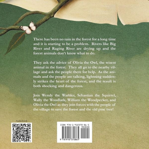 There has been no rain in the forest for a long time and it is starting to be a problem. Rivers like Big River and Raging River are drying up and the forest animals don’t know what to do. They ask the advice of Olivia the Owl, the wisest animal in the forest. They all go to the nearby village and ask the people there for help. As the animals and the people are talking, lightning suddenly strikes the heart of the forest, and the result is both shocking and dangerous. Join Wendy the Warbler, Sebastian the Squirrel, Wally the Woodlark, William the Woodpecker, and Olivia the Owl as they join forces with the people from the village to save the forest and the old pine tree!