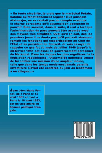 En toute sincérité, je crois que le maréchal Pétain, habitué au fonctionnement régulier d'un puissant état-major, ne se rendait pas un compte exact de la charge écrasante qu'il assumait en acceptant le pouvoir. Bien souvent, dans la suite, il crut à tort que l'administration du pays pouvait être assurée avec des moyens très simplifiés. Quoi qu'il en soit, dès les premiers jours il ne douta pas qu'il pourrait aisément remplir les fonctions qui ressortissaient au Chef de l'État et au président du Conseil. Je vais essayer de rappeler ce que fut du mois de juillet 1940 jusqu'à la mi-février 1941 cet essai de gouvernement personnel du Maréchal. Dans les formes les plus régulières de la législation républicaine, l'Assemblée nationale venait de lui confier une mission d'une ampleur inouïe, telle que dans les temps modernes jamais pareille investiture n'avait été conférée du jour au lendemain à un citoyen...