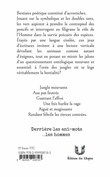 Bestiaire poétique constitué d'acrostiches. Jouant sur la symbolique et les doubles sens, les vers aspirent à prendre le contrepied des poncifs et interrogent en filigrane le rôle de l'Homme dans la survie précaire des espèces. Étayés par une langue ciselée, ces jeux d'écritures invitent à une lecture verticale dévoilant les animaux comme autant d'énigmes, tout en posant en miroir les jalons d'un questionnement ontologique mouvant et essentiel: à l'orée des jungles où se loge véritablement la bestialité? "Derrière les ani-mots, ...les hommes".