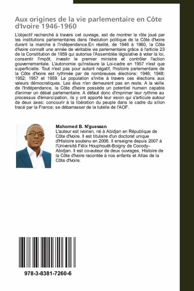 L'objectif recherché à travers cet ouvrage, est de montrer le rôle joué par les institutions parlementaires dans l'évolution politique de la Côte d'Ivoire durant la marche à l'indépendance.En réalité, de 1946 à 1960, la Côte d'Ivoire connaît une année de véritable vie parlementaire grâce à l'article 23 de la Constitution de 1959 qui autorise l'Assemblée législative à voter la loi, consentir l'impôt, investir le premier ministre et contrôler l'action gouvernementale. L'autonomie qu'instaure la Loi-cadre en 1957 n'est que superficielle. Tout n'est pas pour autant négatif, l'histoire parlementaire de la Côte d'Ivoire est rythmée par de nombreuses élections: 1946; 1948; 1952; 1957 et 1959. La population s'initie à travers ces élections aux valeurs démocratiques. Les élus n'en demeurent pas en reste. A la veille de l'Indépendance, la Côte d'Ivoire possède un potentiel humain capable d'animer un débat parlementaire. A défaut donc d'imprimer leur rythme au processus d'émancipation, ils y ont apporté leur vision qui s'articule autour de deux axes: concourir à la libération du peuple dans le cadre du sillon tracé par la France; se débarrasser de la tutelle de l'AOF.