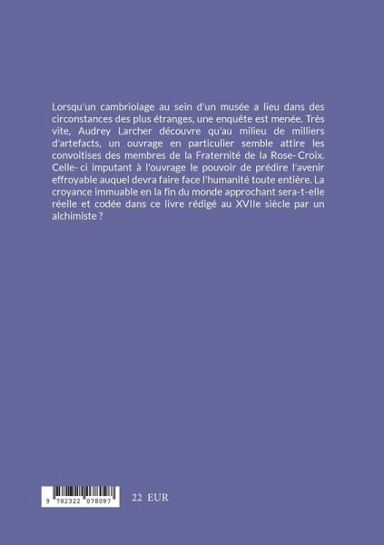 Lorsqu'un cambriolage au sein d'un musée a lieu dans des circonstances des plus étranges, une enquête est menée. Très vite, Audrey Larcher découvre qu'au milieu de milliers d'artefacts, un ouvrage en particulier semble attire les convoitises des membres de la Fraternité de la Rose-Croix. Celle-ci imputant à l'ouvrage le pouvoir de prédire l'avenir effroyable auquel devra faire face l'humanité toute entière. La croyance immuable en la fin du monde approchant sera-t-elle réelle et codée dans ce livre rédigé au XVIIe siècle par un alchimiste ?