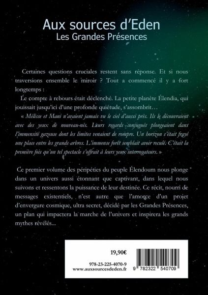 Certaines questions cruciales restent sans réponse. Et si nous traversions ensemble le miroir ? Tout a commencé il y a fort longtemps : Le compte à rebours était déclenché. La petite planète Élendia, qui jouissait jusqu'ici d'une profonde quiétude, s'assombrit..." Mélisse et Mani n'avaient jamais vu le ciel d'aussi près. Leurs regards conjugués plongeaient dans l'immensité gazeuse dont les limites venaient de rompre. Un horizon s'était frayé un place entre les arbres. L'immense forêt semblaient avoir reculé. C'était la première fois qu'un tel spectacle s'offrait à leurs yeux interrogateurs. "Ce premier volume des péripéties du peuple Élendoum nous plonge dans un univers aussi étonnant que captivant, dans lequel nous suivons et ressentons la puissance de leur destinée. Ce récit, nourri de messages existentiels, n'est autre que l'amorce d'un projet d'envergure cosmique, ultra secret, décidé par les Grandes Présences, un plan qui impactera la marche de l'univers et inspirera les grands mythes révélés...