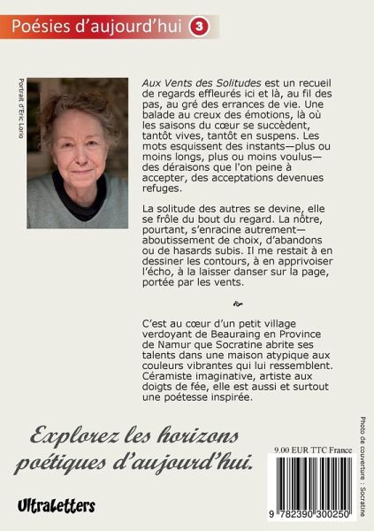 Aux Vents des Solitudes est un recueil de regards effleurés ici et là, au fil des pas, au gré des errances de vie. Une balade au creux des émotions, là où les saisons du coeur se succèdent, tantôt vives, tantôt en suspens. Les mots esquissent des instants - plus ou moins longs, plus ou moins voulus - des déraisons que l'on peine à accepter, des acceptations devenues refuges. La solitude des autres se devine, elle se frôle du bout du regard. La nôtre, pourtant, s'enracine autrement - aboutissement de choix, d'abandons ou de hasards subis. Il me restait à en dessiner les contours, à en apprivoiser l'écho, à la laisser danser sur la page, portée par les vents.