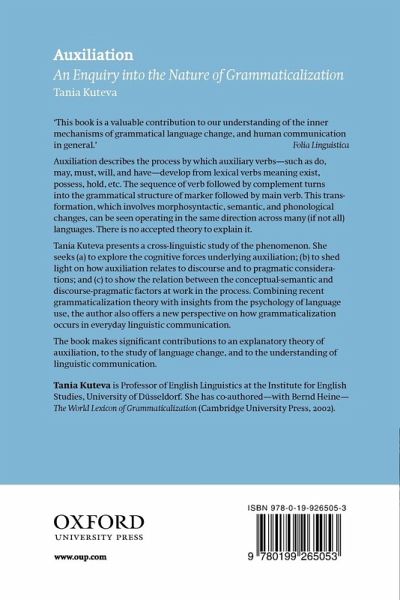 Auxiliation describes the process by which auxiliary verbs - such as do, may, must, will, and have - develop from lexical verbs meaning exist, possess, hold, etc. The sequence of verb followed by complement turns into the grammatical structure of marker followed by main verb. This transformation, which involves morphosyntactic, semantic, and phonological changes, can be seen operating in the same direction across many (if not all) languages. There is no accepted theory to explain it. Tania Kuteva presents a cross-linguistic study of the phenomenon. She seeks: to explore the cognitive forces underlying auxiliation; to shed light on how auxiliation relates to discourse and to pragmatic considerations; and to show the relation between the conceptual-semantic and discourse-pragmatic factors at work in the process. Combining recent grammaticalization theory with insights from the psychology of language use, the author also offers a new perspective on how grammaticalization occurs in everyday linguistic communication. The book makes significant contributions to an explanatory theory of auxiliation, to the study of language change, and to the understanding of linguistic communication.