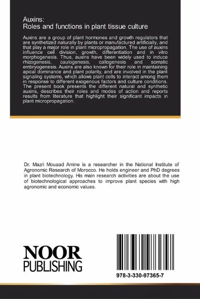 Auxins are a group of plant hormones and growth regulators that are synthetized naturally by plants or manufactured artificially, and that play a major role in plant micropropagation. The use of auxins influence cell division, growth, differentiation and in vitro morphogenesis. Thus, auxins have been widely used to induce rhizogenesis, caulogenesis, callogenesis and somatic embryogenesis. Auxins are also known for their role in maintaining apical dominance and plant polarity, and are involved in the plant signaling systems, which allows plant cells to interact among them in response to different exogenous factors and culture conditions. The present book presents the different natural and synthetic auxins, describes their roles and modes of action and reports results from literature that highlight their significant impacts in plant micropropagation.