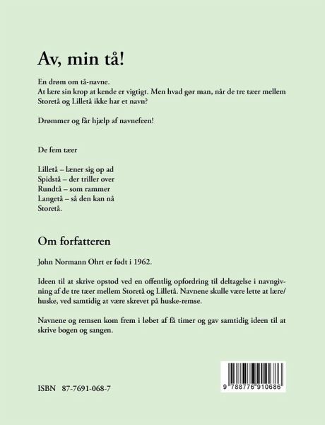 Bogen om et hidtil overset emne; Tå-navne! Nu får de tre tæer mellem Storetå og Lilletå navne. I historien om en drøm hjælper navnefeen med navngivningen. Med 24 ill. og korte tekster skrevet på rim er det en bog, de små hurtigt selv kan lære at læse. Herudover er tå-navnene også skrevet på huske-remse og teksten til sangen er trykt sidst i bogen. Sangen kan hentes på den anførte webadresse.