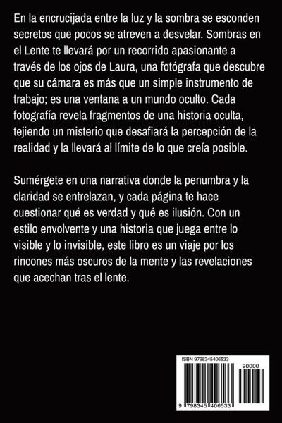 Adéntrate en una historia que difumina los límites entre lo real y lo oculto. Sombras en el Lente es un relato que sigue a Laura, una fotógrafa cuya vida cambia cuando una antigua cámara revela no solo imágenes, sino secretos atrapados en las sombras y la luz. Cada foto es un fragmento de un misterio más grande, un reflejo de una verdad que la empuja al límite de lo conocido y la sumerge en un viaje que la conecta con un legado que ha estado aguardando en silencio. ¿Qué harías si descubrieras que las sombras te observan y la luz guarda secretos que no deberías conocer? Este libro llevará al lector a través de callejones oscuros, visiones proféticas y un equilibrio frágil entre la claridad del día y la penumbra de la noche. Es una historia de revelaciones, enfrentamientos y la aceptación de la dualidad inherente a la existencia.