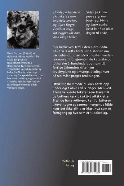 Av træls ætt forteller historien om vår behandling av utviklingshemmede, fra norrøn tid, gjennom de katolske og lutherske århundreder og fram til forrige århundreskifte hvor arvehygiene og omsorgsideologi hver på sin måte preget tenkningen. Utviklingshemmede dukker først opp under eget navn i våre dager. Ved å lese velkjente tekster som Håvamål og Luthers verk på aktivt utkikk etter Træl og hans ætlinger, kan forfatteren likevel tegne et sammenhengende bilde hvor det ikke alltid er klart hva som er fremgang og hva som er tilbakeslag. Slik beskrives Træl for eksempel i Den Eldre Edda: Hadde på hendene skrukkete skinn, knoklete knoker, og digre fingre. Ansiktet stygt, lut-rygget var han, med lange hæler. Siden fikk han prøve styrken: bast-reip binde og bører sanke, kvist bar han hjem dagen til ende. Knut Østrem (f. 1938), er tidligere førstelektor ved Trondheim lærerhøyskole og leder for Norsk Lærerlags avdeling for spesiallærere.
