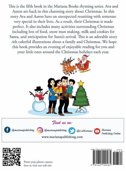This is the fifth book in the Mariana Books rhyming series. Ava and Aaron are back in this charming story about Christmas. In this story Ava and Aaron have an unexpected reuniting with someone very special in their lives. As a result, their Christmas is made perfect. It also includes many activities surrounding Christmas including lots of food, snow man making, milk and cookies for Santa, and anticipation for Santa's arrival. This is an adorable story with colorful illustrations about a family and Christmas. We hope this book provides an evening of enjoyable reading for you and your little ones around the Christmas holidays each year.