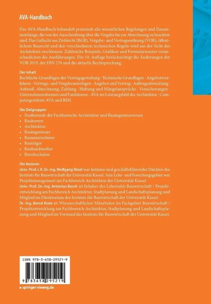 Rechtliche Grundlagen der Vertragsgestaltung.- Technische Grundlagen.- Angebotsverfahren.- Vertrags- und Vergabeunterlagen.- Angebot und Vertrag.- Auftragsabwicklung.- Aufmaß, Abrechnung, Zahlung.- Haftung und Mängelansprüche.- Versicherungen.- Unternehmensformen und Funktionen.- AVA im Leistungsbild des Architekten.- Computergestützte AVA und BIM.
