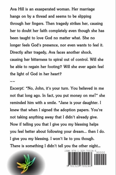 Ava Hill is an exasperated woman. Her marriage hangs on by a thread and seems to be slipping through her fingers. Then tragedy strikes her, causing her to doubt her faith completely even though she has been taught to love God no matter what. She no longer feels God's presence, nor even wants to feel it. Directly after tragedy, Ava faces another shock, causing her bitterness to spiral out of control. Will she be able to regain her footing? Will she ever again feel the light of God in her heart? ~~ Excerpt: "No, John, it's your turn. You believed in me not that long ago. In fact, you put money on me!" she reminded him with a smile. "Jane is your daughter. I knew that when I signed the adoption papers. You're not taking anything away that I didn't already give. Now if telling you that I give you my blessing helps you feel better about following your dream... then I do. I give you my blessing. I won't lie to you though. There is something I didn't tell you the other night...