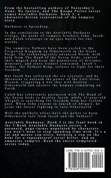 From the bestselling authors of Yesterday's Gone, No Justice, and The Karma Police series comes Available Darkness: Book 3, a character-driven reinvention of the vampire story. Darkness is Spreading. In the conclusion to the Available Darkness trilogy, the paths of vampire brothers John, Jacob, and Caleb converge in an epic battle for two worlds. The vampiric Valkoer have been exiled to the Forgotten Kingdom on Otherworld in the Great Purge. The technologically advanced North, with help from The Hand of the Seven Gods, control their magick and keep the population of deviants, monsters, and slave traders contained. Jacob's father, the Valkoer King, refuses to fight for their freedom. But Jacob has collected the six crystals, and he threatens to unleash the power of the Last Great Wizard, triggering a war that will destroy Otherworld and enslave the humans remaining on Earth. Caleb has reluctantly partnered with The Hand of the Seven Gods to destroy Jacob, while 11-year-old Abigail is searching for freedom from her violent past. When John returns in search of Abigail, he joins the forces fighting to save Otherworld. Will the unlikely allies have the power to keep Otherworld safe from Jacob and the Valkoer? Available Darkness: Book 3 is the final book in the 3-Book Available Darkness series, a paranoid, page-turner populated by characters you won't want to stop spending time with. It's a cat and mouse cop story, between a cop on the hunt for a supernatural serial killer, and an amnesiac vampire. Read the entire completed series today.