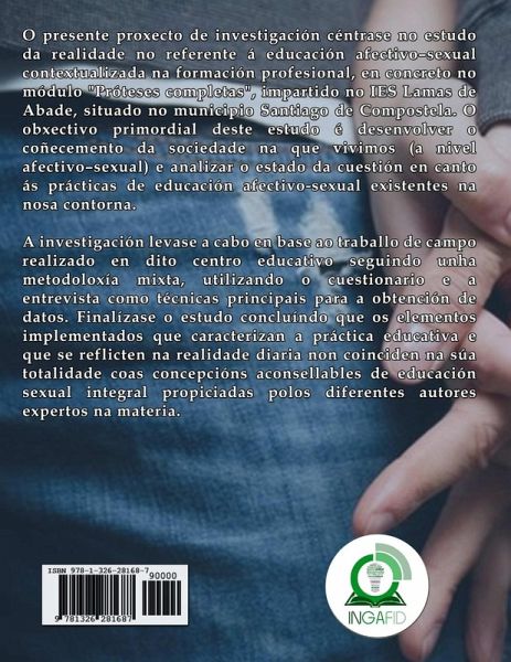 O presente proxecto de investigación céntrase no estudo da realidade no referente á educación afectivo-sexual contextualizada na formación profesional, en concreto no módulo "Próteses completas", impartido no IES Lamas de Abade, situado no municipio Santiago de Compostela. O obxectivo primordial deste estudo é desenvolver o coñecemento da sociedade na que vivimos (a nivel afectivo - sexual) e analizar o estado da cuestión en canto ás prácticas de educación afectivo-sexual existentes na nosa contorna. A investigación levase a cabo en base ao traballo de campo realizado en dito centro educativo seguindo unha metodoloxía mixta, utilizando o cuestionario e a entrevista como técnicas principais para a obtención de datos. Finalízase o estudo concluíndo que os elementos implementados que caracterizan a práctica educativa e que se reflicten na realidade diaria non coinciden na súa totalidade coas concepcións aconsellables de educación sexual integral propiciadas polos diferentes autores expertos na materia.