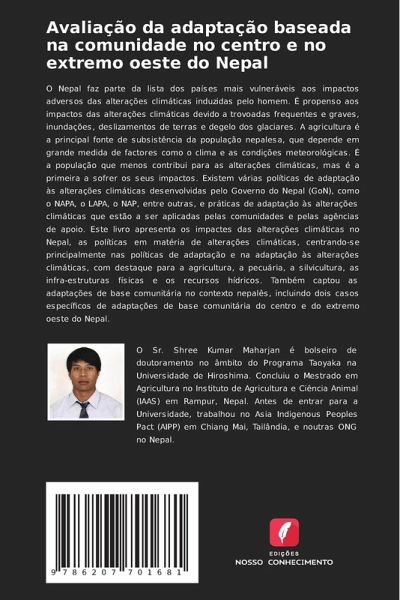 O Nepal faz parte da lista dos países mais vulneráveis aos impactos adversos das alterações climáticas induzidas pelo homem. É propenso aos impactos das alterações climáticas devido a trovoadas frequentes e graves, inundações, deslizamentos de terras e degelo dos glaciares. A agricultura é a principal fonte de subsistência da população nepalesa, que depende em grande medida de factores como o clima e as condições meteorológicas. É a população que menos contribui para as alterações climáticas, mas é a primeira a sofrer os seus impactos. Existem várias políticas de adaptação às alterações climáticas desenvolvidas pelo Governo do Nepal (GoN), como o NAPA, o LAPA, o NAP, entre outras, e práticas de adaptação às alterações climáticas que estão a ser aplicadas pelas comunidades e pelas agências de apoio. Este livro apresenta os impactes das alterações climáticas no Nepal, as políticas em matéria de alterações climáticas, centrando-se principalmente nas políticas de adaptação e na adaptação às alterações climáticas, com destaque para a agricultura, a pecuária, a silvicultura, as infra-estruturas físicas e os recursos hídricos. Também captou as adaptações de base comunitária no contexto nepalês, incluindo dois casos específicos de adaptações de base comunitária do centro e do extremo oeste do Nepal.