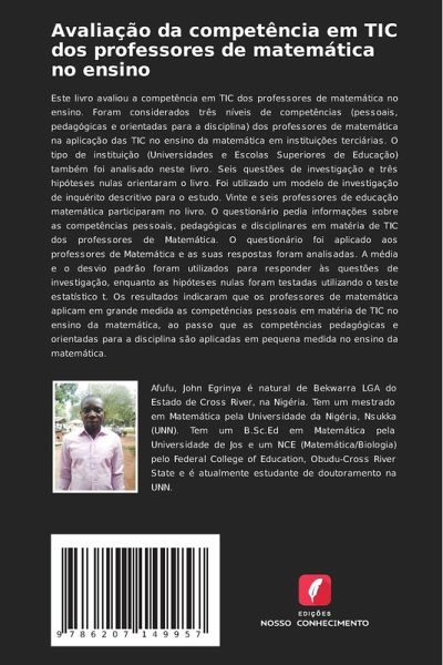 Este livro avaliou a competência em TIC dos professores de matemática no ensino. Foram considerados três níveis de competências (pessoais, pedagógicas e orientadas para a disciplina) dos professores de matemática na aplicação das TIC no ensino da matemática em instituições terciárias. O tipo de instituição (Universidades e Escolas Superiores de Educação) também foi analisado neste livro. Seis questões de investigação e três hipóteses nulas orientaram o livro. Foi utilizado um modelo de investigação de inquérito descritivo para o estudo. Vinte e seis professores de educação matemática participaram no livro. O questionário pedia informações sobre as competências pessoais, pedagógicas e disciplinares em matéria de TIC dos professores de Matemática. O questionário foi aplicado aos professores de Matemática e as suas respostas foram analisadas. A média e o desvio padrão foram utilizados para responder às questões de investigação, enquanto as hipóteses nulas foram testadas utilizando o teste estatístico t. Os resultados indicaram que os professores de matemática aplicam em grande medida as competências pessoais em matéria de TIC no ensino da matemática, ao passo que as competências pedagógicas e orientadas para a disciplina são aplicadas em pequena medida no ensino da matemática.