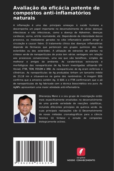 A inflamação é uma das principais ameaças à saúde humana e desempenha um papel importante no desenvolvimento de várias doenças infecciosas e não infecciosas, como a doença de Alzheimer, doenças cardíacas, asma, artrite reumatoide, etc. Dependendo da intensidade desse processo, os mediadores gerados no sítio inflamatório podem atingir a circulação e causar febre. O tratamento clínico das doenças inflamatórias depende de fármacos que pertencem aos grupos químicos dos não esteróides ou dos esteróides. A utilização de extractos de plantas na síntese verde de nanopartículas de prata tem várias vantagens em relação aos processos convencionais, uma vez que são benéficos, simples de melhorar e amigos do ambiente. As caraterísticas estruturais e morfológicas das nanopartículas de Ag foram investigadas utilizando UV-Visível, FTIR, TEM, FESEM e XRD. As nanopartículas de Ag eram esféricas e cilíndricas. As nanopartículas de Ag produzidas tinham um tamanho médio de 23,18 nm e situavam-se na gama dos nanómetros. A imagem EDS confirma que a amostra contém Ag. O EDS e o FTIR confirmaram que o pó de nanopartículas de Ag fabricado com a técnica biossintética era puro. As AgNPs apresentam uma maior atividade anti-inflamatória.