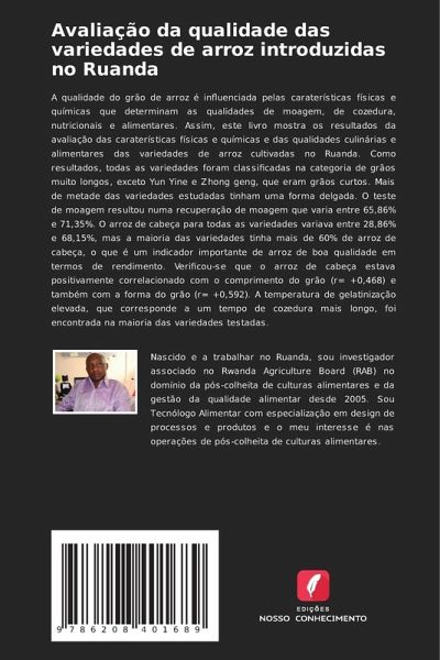 A qualidade do grão de arroz é influenciada pelas caraterísticas físicas e químicas que determinam as qualidades de moagem, de cozedura, nutricionais e alimentares. Assim, este livro mostra os resultados da avaliação das caraterísticas físicas e químicas e das qualidades culinárias e alimentares das variedades de arroz cultivadas no Ruanda. Como resultados, todas as variedades foram classificadas na categoria de grãos muito longos, exceto Yun Yine e Zhong geng, que eram grãos curtos. Mais de metade das variedades estudadas tinham uma forma delgada. O teste de moagem resultou numa recuperação de moagem que varia entre 65,86% e 71,35%. O arroz de cabeça para todas as variedades variava entre 28,86% e 68,15%, mas a maioria das variedades tinha mais de 60% de arroz de cabeça, o que é um indicador importante de arroz de boa qualidade em termos de rendimento. Verificou-se que o arroz de cabeça estava positivamente correlacionado com o comprimento do grão (r= +0,468) e também com a forma do grão (r= +0,592). A temperatura de gelatinização elevada, que corresponde a um tempo de cozedura mais longo, foi encontrada na maioria das variedades testadas.