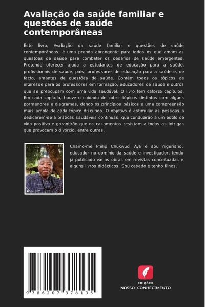 Este livro, Avaliação da saúde familiar e questões de saúde contemporâneas, é uma prenda abrangente para todos os que amam as questões de saúde para combater os desafios de saúde emergentes. Pretende oferecer ajuda a estudantes de educação para a saúde, profissionais de saúde, pais, professores de educação para a saúde e, de facto, amantes de questões de saúde. Contém todos os tópicos de interesse para os professores em formação, educadores de saúde e outros que se preocupam com uma vida saudável. O livro tem catorze capítulos. Em cada capítulo, houve o cuidado de cobrir tópicos distintos com alguns pormenores e diagramas, dando os princípios básicos e uma compreensão mais ampla de cada tópico discutido. O objetivo é estimular as pessoas a dedicarem-se a práticas saudáveis contínuas, que conduzirão a um estilo de vida positivo e garantirão que os casamentos resistam a todas as intrigas que provocam o divórcio, entre outras.