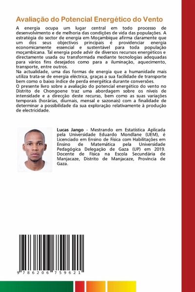 A energia ocupa um lugar central em todo processo de desenvolvimento e de melhoria das condições de vida das populações. A estratégia do sector de energia em Moçambique afirma claramente que um dos seus objectivos principais é providenciar energia economicamente essencial e sustentável para toda população moçambicana. Tal energia pode advir de diversos recursos energéticos e directamente usada ou transformada mediante tecnologias adequadas para vários fins desejados como para a iluminação, aquecimento, transporte, entre outros.Na actualidade, uma das formas de energia que a humanidade mais utiliza trata-se de energia eléctrica, graças a sua facilidade de transporte bem como o baixo índice de perda energética durante conversões.O presente livro sobre a avaliação do potencial energético do vento no Distrito de Chongoene traz uma abordagem sobre os níveis de intensidade e a direcção deste recurso, bem como as suas variações temporais (horárias, diurnais, mensal e sazonais) com a finalidade de determinar a possibilidade da sua exploração relativamente à produção de electricidade.