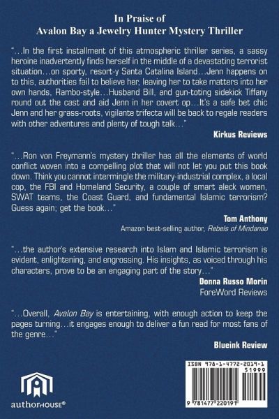 Avalon Bay: A Jewelry Hunter Thriller is a mystery thriller set in the legendary town of Avalon on the idyllic island of Catalina. Jenn, a retail jewelry marketer known as the Jewelry Hunter, inadvertently learns that a fundamental Islamic terrorist sleeper cell comprised, in part of American Caucasian women converts to Islam, plans to destroy two tourist ferries that service Catalina. Unable to convince local authorities, the FBI, or Homeland Security of the threat, she, her friend Tiffany, and her husband, Bill, resolve to thwart the terrorists on their own. Jenn confronts and captures the cell's Saudi born cell leader when he attempts to initiate the plot from a commuter helicopter flying over the two ferries. This leaves the suicide bombers on each ferry to act on their own. Jenn must determine a way to prevent them from completing the plot before the ferries enter the Long Beach and Avalon harbours without alerting the terrorist that the plot has been discovered and their leader captured.