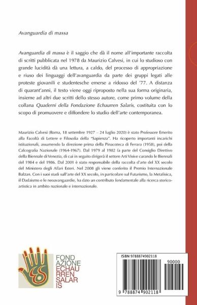 Avanguardia di massa è il saggio che dà il nome all'importante raccolta di scritti pubblicata nel 1978 da Maurizio Calvesi, in cui lo studioso con grande lucidità dà una lettura, a caldo, del processo di appropriazione e riuso dei linguaggi dell'avanguardia da parte dei gruppi legati alle proteste giovanili e studentesche emerse a ridosso del '77. A distanza di quarant'anni, il testo viene oggi riproposto nella sua forma originaria, insieme ad altri due scritti dello stesso autore, come primo volume della collana Quaderni della Fondazione Echaurren Salaris, costituita con lo scopo di promuovere e diffondere lo studio dell'arte contemporanea. La collana della Fondazione Echaurren Salaris nasce allo scopo di promuovere e diffondere lo studio dell'arte e della cultura visiva del XX e XXI secolo, attraverso la pubblicazione di saggi, traduzioni, riedizioni e volumi miscellanei che approfondiscano la storia delle prime avanguardie, delle neoavanguardie e, soprattutto, della controcultura italiana e internazionale.
