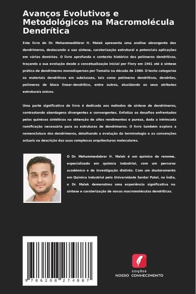 Este livro do Dr. MohammedAbrar H. Malek apresenta uma análise abrangente dos dendrímeros, destacando a sua síntese, caraterização estrutural e potenciais aplicações em vários domínios. O livro aprofunda o contexto histórico dos polímeros dendríticos, traçando a sua evolução desde a concetualização inicial por Flory em 1941 até à síntese prática de dendrímeros monodispersos por Tomalia na década de 1980. O texto categoriza os materiais dendríticos em subclasses, tais como polímeros dendríticos, dendrões, polímeros de bloco linear-dendrítico, entre outros, elucidando os seus atributos estruturais únicos. Uma parte significativa do livro é dedicada aos métodos de síntese de dendrímeros, contrastando abordagens divergentes e convergentes. Enfatiza os desafios enfrentados pelos químicos sintéticos na obtenção de altos rendimentos e pureza, dada a intrincada ramificação necessária para as estruturas de dendrímeros. O livro também explora a nomenclatura dos dendrímeros, detalhando a evolução da terminologia e as convenções actuais na descrição das suas complexas arquitecturas moleculares.