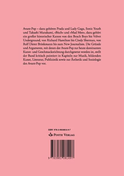 Avant-Pop - dazu gehören Prada und Lady Gaga, Sonic Youth und Takashi Murakami, 'Bitch' und 'Mad Men', dazu gehört ein großer historischer Kanon von den Beach Boys bis Velvet Underground, von Richard Hamilton bis Cindy Sherman, von Rolf Dieter Brinkmann bis zum New Journalism. Die Gründe und Argumente, mit denen der Avant-Pop zur heute dominanten Kunst- und Geschmacksrichtung durchgesetzt worden ist, stellt der Band kritisch pointiert in Kapiteln zur Musik, bildenden Kunst, Literatur, Publizistik sowie zur Ästhetik und Soziologie des Avant-Pop vor.