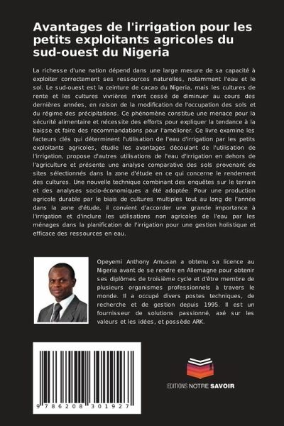 La richesse d'une nation dépend dans une large mesure de sa capacité à exploiter correctement ses ressources naturelles, notamment l'eau et le sol. Le sud-ouest est la ceinture de cacao du Nigeria, mais les cultures de rente et les cultures vivrières n'ont cessé de diminuer au cours des dernières années, en raison de la modification de l'occupation des sols et du régime des précipitations. Ce phénomène constitue une menace pour la sécurité alimentaire et nécessite des efforts pour expliquer la tendance à la baisse et faire des recommandations pour l'améliorer. Ce livre examine les facteurs clés qui déterminent l'utilisation de l'eau d'irrigation par les petits exploitants agricoles, étudie les avantages découlant de l'utilisation de l'irrigation, propose d'autres utilisations de l'eau d'irrigation en dehors de l'agriculture et présente une analyse comparative des sols provenant de sites sélectionnés dans la zone d'étude en ce qui concerne le rendement des cultures. Une nouvelle technique combinant des enquêtes sur le terrain et des analyses socio-économiques a été adoptée. Pour une production agricole durable par le biais de cultures multiples tout au long de l'année dans la zone d'étude, il convient d'accorder une grande importance à l'irrigation et d'inclure les utilisations non agricoles de l'eau par les ménages dans la planification de l'irrigation pour une gestion holistique et efficace des ressources en eau.
