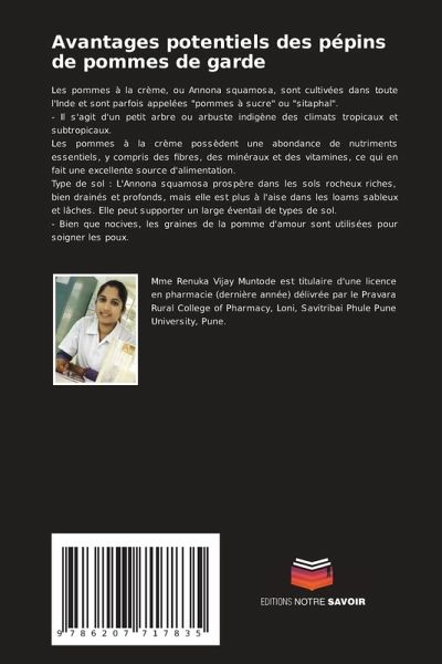 Les pommes à la crème, ou Annona squamosa, sont cultivées dans toute l'Inde et sont parfois appelées "pommes à sucre" ou "sitaphal".- Il s'agit d'un petit arbre ou arbuste indigène des climats tropicaux et subtropicaux.Les pommes à la crème possèdent une abondance de nutriments essentiels, y compris des fibres, des minéraux et des vitamines, ce qui en fait une excellente source d'alimentation.Type de sol : L'Annona squamosa prospère dans les sols rocheux riches, bien drainés et profonds, mais elle est plus à l'aise dans les loams sableux et lâches. Elle peut supporter un large éventail de types de sol.- Bien que nocives, les graines de la pomme d'amour sont utilisées pour soigner les poux.