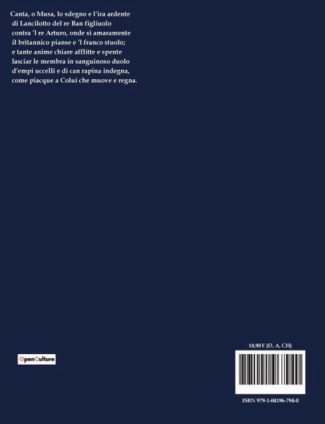 Canta, o Musa, lo sdegno e l¿ira ardente di Lancilotto del re Ban figliuolo contra ¿l re Arturo, onde sì amaramente il britannico pianse e ¿l franco stuolo; e tante anime chiare afflitte e spente lasciar le membra in sanguinoso duolo d¿empi uccelli e di can rapina indegna, come piacque a Colui che muove e regna.