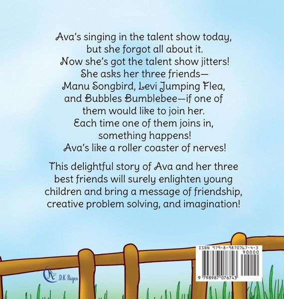 Embark on a delightful journey with Ava and her three best friends in this charming tale of unexpected surprises and friendship. Follow Ava as she faces the ultimate challenge - singing in the talent show, completely forgetting about it until the last moment. As the nerves set in, Ava must rely on her friends and their creative problem-solving skills to help her overcome her jitters and discover the true power of friendship. This heartwarming children's picture book beautifully showcases the value of true friendship and the importance of finding innovative ways to boost confidence and conquer nervousness. Ava & Friends: Ava is a sweet 9-year-old girl who enjoys playing and singing with her three best friends. Manu Songbird is a handsome boy bird who likes to zoom around, whistle, and sing! Levi Jumping Flea has a giggly personality. He enjoys playing his 4-string 'ukulele and carries it with him wherever he goes. Bubbles Bumblebee is a cute girl bumblebee. Sometimes bubbles come out of her antennae! Definition of two Hawaiian words: 1) Manu means "bird." 2) 'Ukulele (also ukulele) means "jumping flea" (uku - flea; lele - jump/to jump).