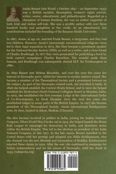 Annie Besant (née Wood; 1 October 1847 – 20 September 1933) was a British socialist, theosophist, women's rights activist, writer, orator, educationist, and philanthropist. Regarded as a champion of human freedom, she was an ardent supporter of both Irish and Indian self-rule. She was a prolific author with over three hundred books and pamphlets to her credit. As an educationist, her contributions included the founding of the Banaras Hindu University. In 1867, Annie, at age 20, married Frank Besant, a clergyman, and they had two children. However, Annie's increasingly unconventional religious views led to their legal separation in 1873. She then became a prominent speaker for the National Secular Society (NSS), as well as a writer, and a close friend of Charles Bradlaugh. In 1877 they were prosecuted for publishing a book by birth control campaigner Charles Knowlton. The scandal made them famous, and Bradlaugh was subsequently elected M.P. for Northampton in 1880. In 1890 Besant met Helena Blavatsky, and over the next few years her interest in theosophy grew, whilst her interest in secular matters waned. She became a member of the Theosophical Society and a prominent lecturer on the subject. As part of her theosophy-related work, she travelled to India. In 1898 she helped establish the Central Hindu School, and in 1922 she helped establish the Hyderabad (Sind) National Collegiate Board in Mumbai, India. In 1902, she established the first overseas Lodge of the International Order of Co-Freemasonry, Le Droit Humain. Over the next few years she established lodges in many parts of the British Empire. In 1907 she became president of the Theosophical Society, whose international headquarters were, by then, located in Adyar, Madras, (Chennai). She also became involved in politics in India, joining the Indian National Congress. When World War I broke out in 1914, she helped launch the Home Rule League to campaign for democracy in India, and dominion status within the British Empire. This led to her election as president of the India National Congress, in late 1917. In the late 1920s, Besant travelled to the United States with her protégé and adopted son Jiddu Krishnamurti, who she claimed was the new Messiah and incarnation of Buddha. Krishnamurti rejected these claims in 1929. After the war, she continued to campaign for Indian independence and for the causes of theosophy, until her death in 1933. (wikipedia.org)