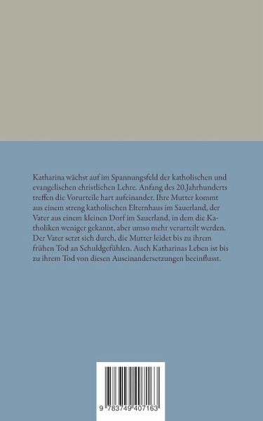 Katharina wächst auf im Spannungsfeld der katholischen und evangelischen christlichen Lehre. Anfang des 20.Jahrhunderts treffen die Vorurteile hart aufeinander. Ihre Mutter kommt aus einem streng katholischen Elternhaus im Sauerland, der Vater aus einem kleinen Dorf im Sauerland, in dem die Katholiken weniger gekannt, aber umso mehr verurteilt werden. Der Vater setzt sich durch, die Mutter leidet bis zu ihrem frühen Tod an Schuldgefühlen. Auch Katharinas Leben ist bis zu ihrem Tod von diesen Auseinandersetzungen beeinflusst.