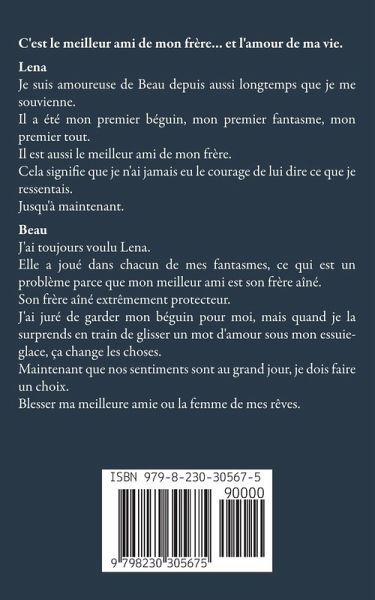 C'est le meilleur ami de mon frère... et l'amour de ma vie. Lena Je suis amoureuse de Beau depuis aussi longtemps que je me souvienne. Il a été mon premier béguin, mon premier fantasme, mon premier tout. Il est aussi le meilleur ami de mon frère. Cela signifie que je n'ai jamais eu le courage de lui dire ce que je ressentais. Jusqu'à maintenant. Beau J'ai toujours voulu Lena. Elle a joué dans chacun de mes fantasmes, ce qui est un problème parce que mon meilleur ami est son frère aîné. Son frère aîné extrêmement protecteur. J'ai juré de garder mon béguin pour moi, mais quand je la surprends en train de glisser un mot d'amour sous mon essuie-glace, ça change les choses. Maintenant que nos sentiments sont au grand jour, je dois faire un choix. Blesser ma meilleure amie ou la femme de mes rêves.