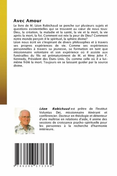 Le livre de M. Léon Robichaud se penche sur plusieurs sujets et questions existentielles qui se trouvent au coeur de nous tous: Dieu, la création, la maladie et la santé, la vie et la mort, la vie après la mort, la foi. Comment est née la peur de Dieu? Comment notre monde perçoit-il le spirituel, la sphère divine? Léon nous écrit en s'inspirant de divers philosophes et à travers ses propres expériences de vie. Comme ses expériences personnelles à travers sa jeunesse, sa formation en tant que missionnaire volontaire et son expérience où il assiste aux funérailles du fils né prématurément de M. et Mme John F. Kennedy, Président des États-Unis. Ou comme celle où il a lui-même frôlé la mort. Toujours en se laissant guider par la source divine.