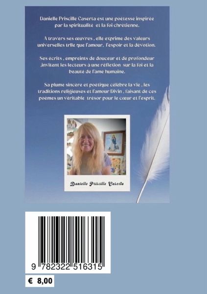 Le livre "Avec la plume du Ciel" de Danielle Priscille Caserta est un recueil de poésies d'inspiration religieuse et spirituelle. Les textes exaltent des valeurs telles que la foi, l'amour, l'espérance et la charité, rendant souvent hommage à des figures chrétiennes comme Jésus Christ, la Vierge Marie, Saint Joseph et les saints (Saint Antoine, Saint Paul, Sainte Philomène entre autres) et Notre Dame de Fatima. Ces poèmes reflètent des thèmes tels que l'amour Divin, le pouvoir de la prière, la signification des sacrements et la quête de consolation spirituelle. Avec un langage lyrique et dévotionnel, l'auteur invite les lecteurs à plonger dans la spiritualité. et l'engagement envers Dieu, tout en promouvant une vie de foi et d'amour pour autrui.