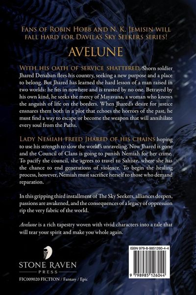 With his oath of service shattered, Shorn soldier Jhared Denaban flees his country, seeking a new purpose and a place to belong. But Jhared has learned the hard lesson of a man raised in two worlds: he fits in nowhere and is trusted by no one. Betrayed by his own kind, he seeks the mercy of Mayavana, a woman who knows the anguish of life on the borders. When Jhared's desire for justice ensnares them both in a plot that echoes the horrors of the past, he must find a way to escape or become the weapon that will annihilate every soul from the Paths. Lady Nemiah opened Jhared's chains hoping to use his strength to slow the world's unraveling. Now Jhared is gone and the Council of Clans is going to punish Nemiah for her crime. To pacify the council, she agrees to travel to Sahiste, where she has the chance to end generations of violence. To begin the healing process, however, Nemiah must sacrifice herself to those who demand reparation. In this gripping third installment of The Sky Seekers, alliances deepen, passions are awakened, and the consequences of a legacy of oppression rip the very fabric of the world. Avelune is a rich tapestry woven with vivid characters into a tale that will tear your spirit and make you whole again.